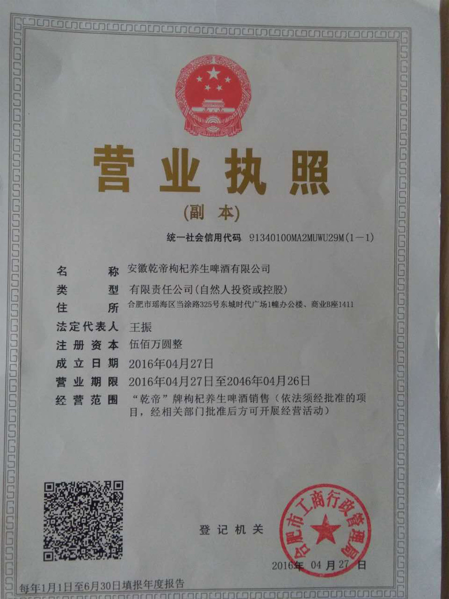 | 公司名稱: | 乾帝枸杞養生啤酒股份有限公司 | ||